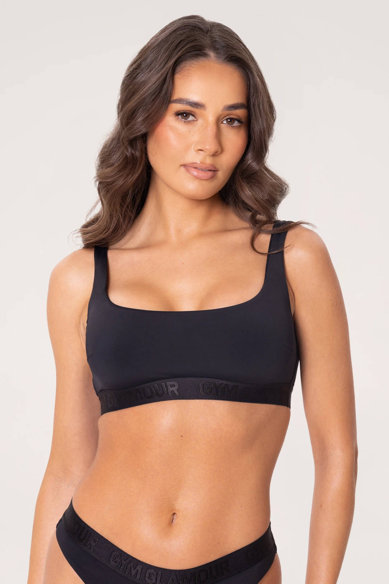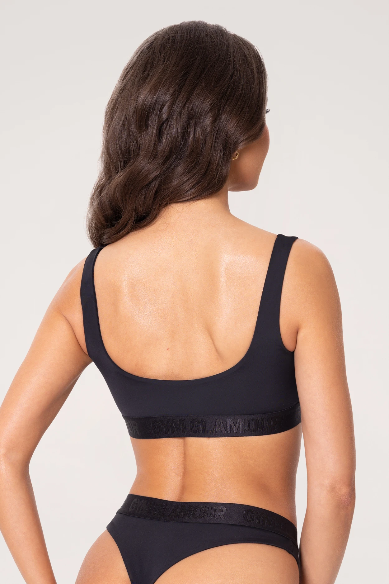- Jednobarevné logo Gym Glamour na elastické žakárové gumě pod prsy zajišťuje ideální přizpůsobení a sportovní vzhled, díky čemuž je podprsenka originální volbou na pláž nebo k bazénu.