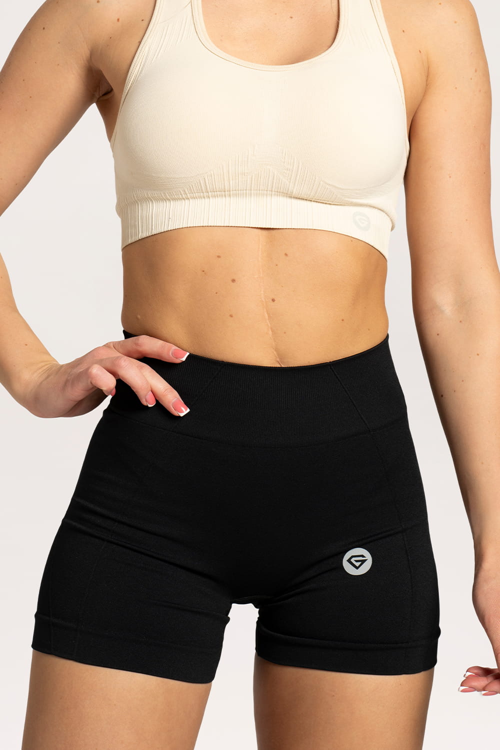 - Inovativní pas, který je vyroben ze dvou selekcí a směrem nahoru se zužuje. Díky tomu je břicho dokonale zpevněné a šortky nesklouzávají dolů.